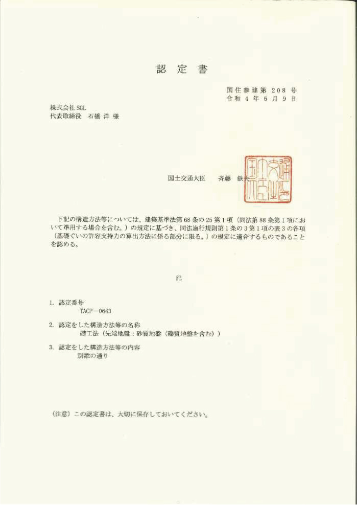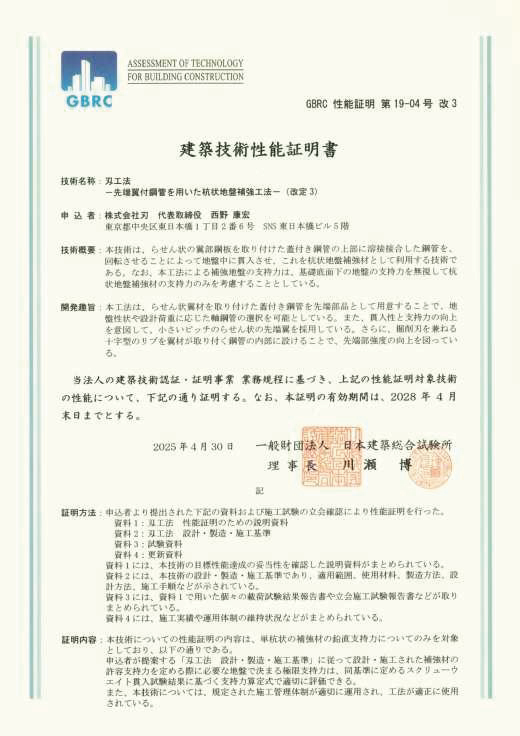 - 性能証明取得済み:GBRC 建築技術性能証明 第19-04 号改3 を取得しており、各種地盤保証制度にも対応可能です。