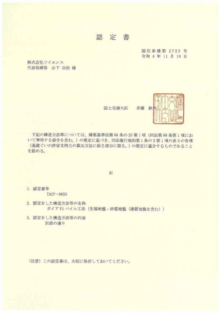 ◆ ガイアF1 パイルSR 工法【建築技術性能証明工法】